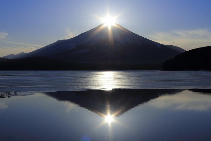 今日の山中湖は晴れ、今朝の最低気温−13℃。最高気温は1.9℃で寒い1日でしたが日差しは暖かく感じました。今朝は紅富士がきれいだったようです。夕方はご覧のようにダイヤモンド富士が綺麗に撮れました。氷が無いところでは、写真のようにダブルダイヤモンド富士になりました。時間は午後4時30分です。