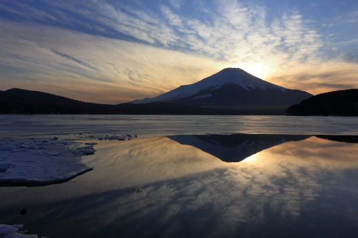 今日の山中湖は晴れ、今朝の最低気温は-13.8℃でまだまだ強烈な寒さの朝でした。日中の最高気温は4℃でしたが、日差しは暖かく感じました。写真はダイヤモンド富士後の午後4時50分、空は赤くなりませんでしたが、湖水が鏡のようでまるで万華鏡のようでした。幻想的な時間でした。