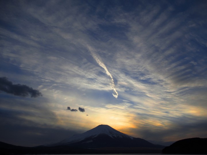 今日の山中湖は晴れ、今朝の最低気温は−1℃、日中の最高気温は11℃、ともに4月上旬の気温でした。写真は午後5時10分、富士山の上には絵の具で描いたような雲が広がっていました。雲はいつも変化していて、見ていて楽しいです。