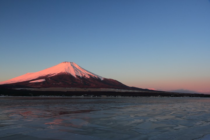 今日の山中湖は晴れ、今朝の最低気温は-17.0℃、最高気温は2℃でした。写真は山中湖からの紅富士です。朝6時40分、真っ赤にはなりませんでしたが、山頂の雪が次第にほんのりピンク色に染まっていきました。ちなみに昨日は全く赤くなりませんでした。現在、山中湖は半分ほど結氷して、模様のある氷や草原のような白い氷、写真のような透明感のある氷の場所では逆さ富士となります。山中湖はいろいろな場所から富士山が撮れますので、おすすめです。