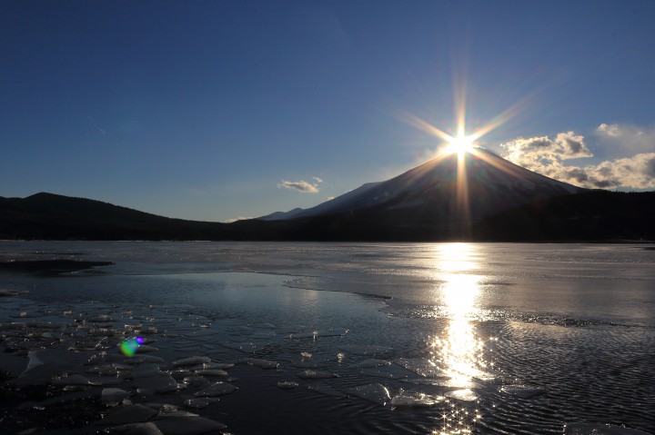 今日の山中湖は晴れ、今朝の最低気温は-14.7℃、最高気温は1.2℃、立春の昨夜から強烈な寒波が来ています。写真は午後4時、山中湖長池親水公園から撮ったダイヤモンド富士です。凍った湖には、長い1本のダイヤモンドが光っていました。雲が出てきたので心配しましたが、無事にダイヤモンド富士になりました。周りには、たくさんのカメラマンがいて、この一瞬を堪能していました。