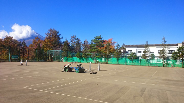季節外れの台風22号は昨夜8時ころ過ぎていきました。総雨量は庭バケツで250mmでした。今日の山中湖は快晴、風はやや強く最高気温13.6℃よりも寒く感じました。今朝の最低は2.1℃。今日の日没は、当館コートで16:00でした。この時期は夕日が富士山に沈むので日没が早いです。写真は10時、青空の下でコート整備が出来て気持ちがよかったです。17/10/30