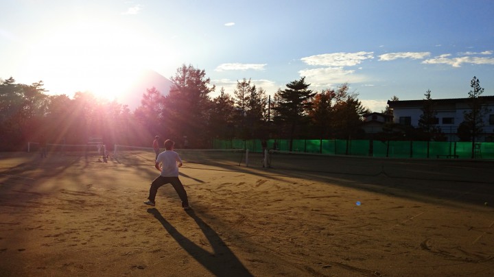 今日の山中湖はまさに秋晴れ、朝から晴天となっていました。最高気温は18.8℃、9月下旬並でした。夏日を記録した地域もあるようです。今朝の最低は2.9℃で朝露がかなり出てました。今日からお泊まりのお客様、山中湖2泊合宿よろしくお願いします。写真は当館コートからの日没時の写真です。時間は午後4時3分、プレーヤーの影が伸びていい感じでした。