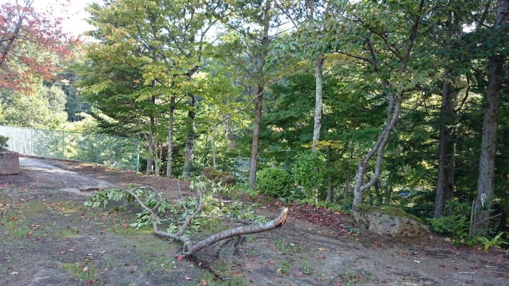 今日の山中湖は晴れ、日中の最高気温は23℃、今朝の最低は13℃。写真は先日の台風18号が去った翌日に見つけた桜の木です。庭には腕よりも太い木の枝が何本も強風により折れて落ちていましたが、まさか桜の木本体が折れているとは思いませんでした。残った桜の木は長生きしてほしいです。17/09/19