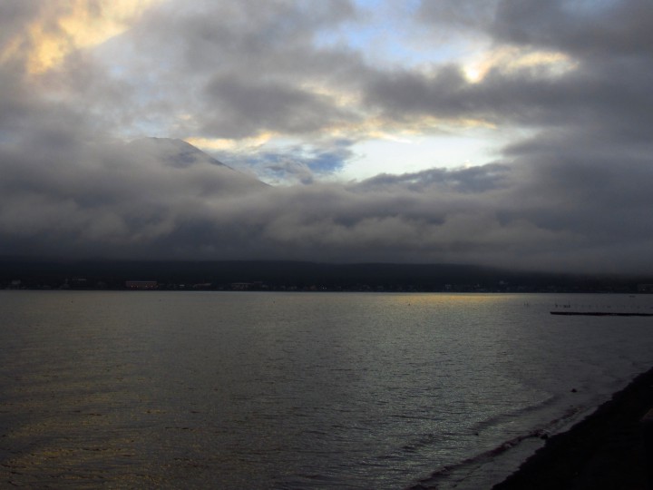 昨夜9時から降り出し雨は朝6時には止み総雨量は庭バケツで40mmでした。その後は曇り時々晴れで最高気温は19℃、今朝の最低は13℃。写真は午後5時40分、富士山がちらっと見えた瞬間でした。今日は秋分の日、昼と夜の時間が同じと言われています。そして「暑さ寒さも彼岸まで」とも言われています。はっきり言って山中湖はすでに寒いです。