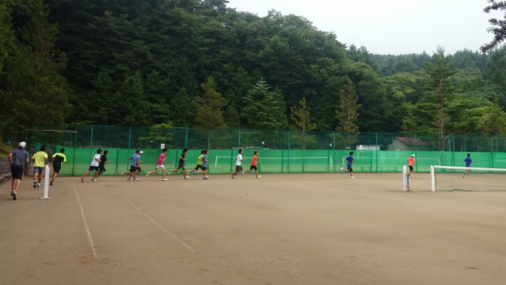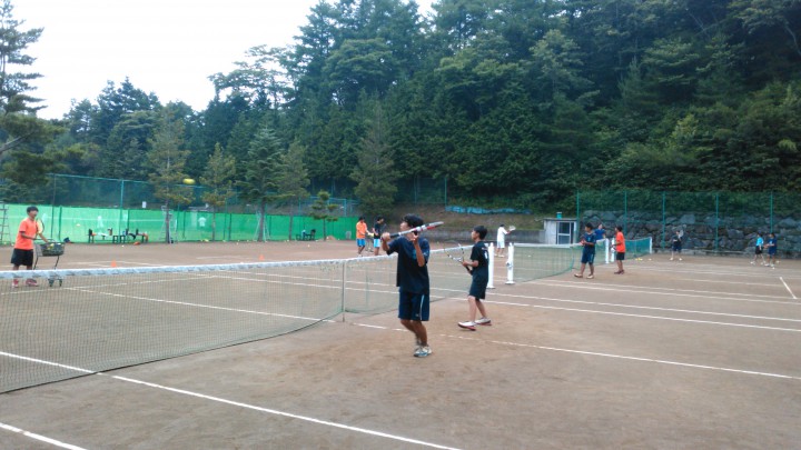 今日の山中湖は一日中日が差さず9〜10時には総雨量2mmの雨が降りました。最高気温は朝10時前に27℃、その後はだんだんと気温が下がり夜には18℃、パーカーは必須アイテムです。宿泊中の高校生は今日で2日目、多少の雨などには全然ひるみません。各コートに分かれて球出し練習を頑張っていました。写真は女子、先生も混じって真剣そのものです。