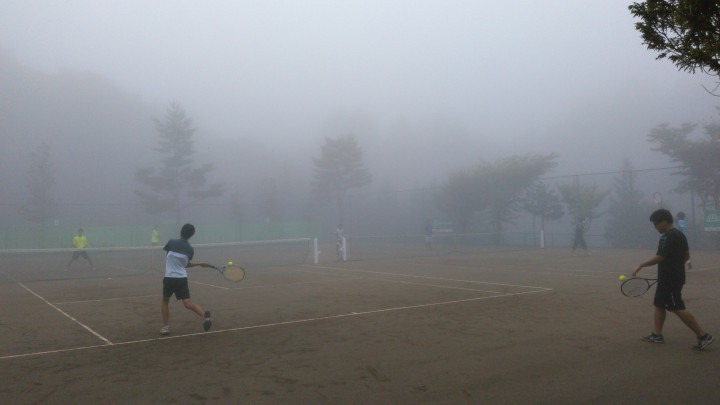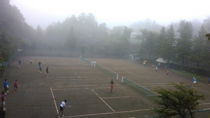 昨晩の雨量は庭バケツで20mm、結構降りました。朝も5時に1mm、10時〜11時に3mmの雨。午後も小雨が降ったり止んだり。最近天気が悪い山中湖です。写真は午後3時、宿泊中の高校生は濃霧の中でのテニスとなりました。生徒たちは先生からいろいろ教えてもらいながら一生懸命頑張っています。最高気温は24℃最低20℃