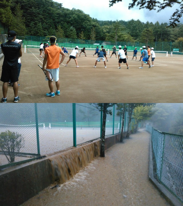29日からお泊まりの高校生の皆さま、山中湖3泊合宿お疲れ様でした。硬式・軟式テニス部ともに先生の熱い指導で有意義な合宿になったと思います。スタッフ一同、またのお越しをお待ちしています。ご利用ありがとうございました。今日からお越しの高校生の皆さま、今年もよろしくお願いします。今日は午前曇り午後2時30から突然土砂降りの雨で3時30分までの1時間で庭バケツに80mm貯まりました。写真上が午後1時、下が午後3時テニスコートは滝のようでした。