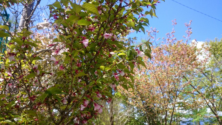今日の山中湖はお昼頃から夏のようなムシムシした強烈な日差しとなり、最高気温は15時で26.8℃、気象庁では最も暑い時期を上回るとのことでした。今朝の最低が1.5℃でしたので、今日一日の温度差は25℃以上。お越しの際は体調管理には気を付けて下さい。写真は共立テニスロッヂの八重桜です。満開時期は過ぎましたが青空にピンクの花がとても綺麗でした。17/05/08