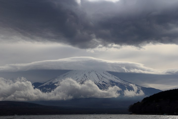 今日の山中湖は曇り、日中はすさまじい強風でテニスコートの砂は全て飛んでしまいました。今朝の最低気温は4℃日中の最高は16℃でした。写真は午後4時の富士山です。強風の中、山頂には巨大な傘雲が掛かっていました。傘雲の大きさは写真には納まりきれず、左右に2倍ほど伸びていました。今日は夕方から雨予報でしたが、雨は降らずに明日に移ったようです。17/04/26