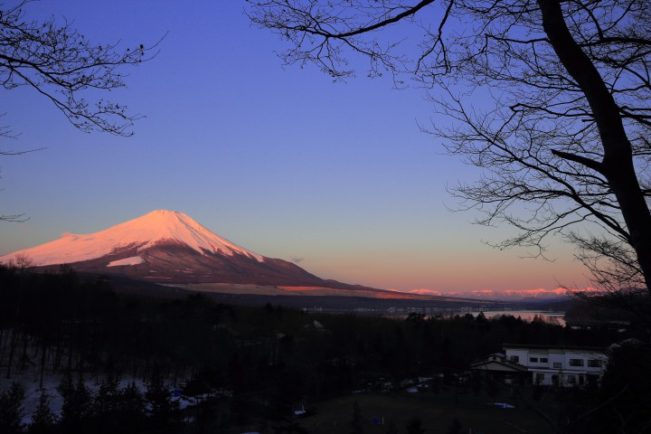 朝6時15分、気温-6℃の山中湖。共立テニスロッヂ展望台から紅富士を撮りました。富士山の右にはビーナスベルト、南アルプスもピンク色に染まってとても綺麗でした。一段と富士山が大きく見えますね。2月もあとわずか、この綺麗な紅富士が毎日見られるといいですね。