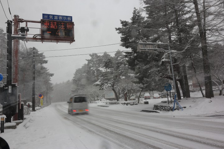 朝は快晴の山中湖、午後からは本降りの雪となりました。予報では晴れでしたが半日以上雪が降り続け、積雪は10cm。今朝の最低気温は-7℃でしたが、日中は0.6℃までしか気温が上がらず雪も降っていて寒い1日でした。夜は更に冷え込み午後11時に-11℃。明日の朝は寒そうです。写真は午後4時30分の国道413号線です。時折吹雪いて辺りが真っ白になりました。