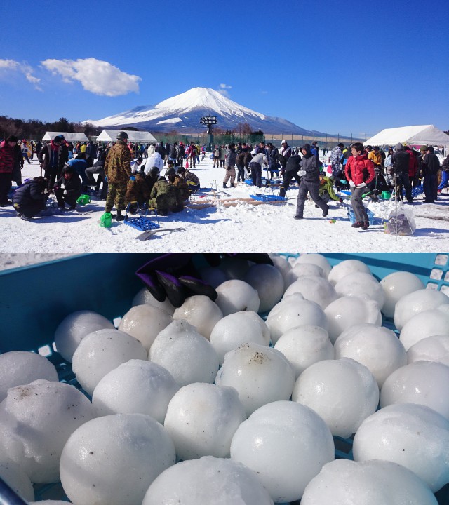 平成29年2月12日の今日、山中湖きららにて第11回山梨県雪合戦大会が開催されました。晴天の山中湖会場は、見事な富士山をバックに大勢の人で大盛り上がりでした。地元からは平野旅館民宿組合「青年部」が出場します。がんばって欲しいと思います。使用される雪玉は現地で製作していますが、結構硬くて驚きました(試合は防具着用です)。今朝の最低-7℃最高3℃17/02/12