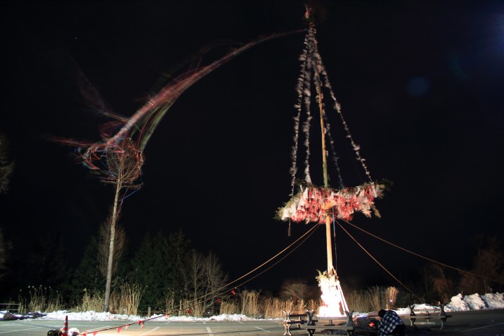 今日は1月14日に建てられた御神木を倒す日です。朝6時から、朝日が昇る前に倒されます。その後、御神木に飾り付けられてた旗を各家庭に配ります。「交通安全、商売繁盛、家内安全」が書かれた有り難い旗です。今日の山中湖は晴れ、今朝の最低気温-5℃、日中は暖かく5℃まで気温が上がりました。写真は建てられた1/14夜の御神木です。てっぺんの飾りが羽ばたいていました。
