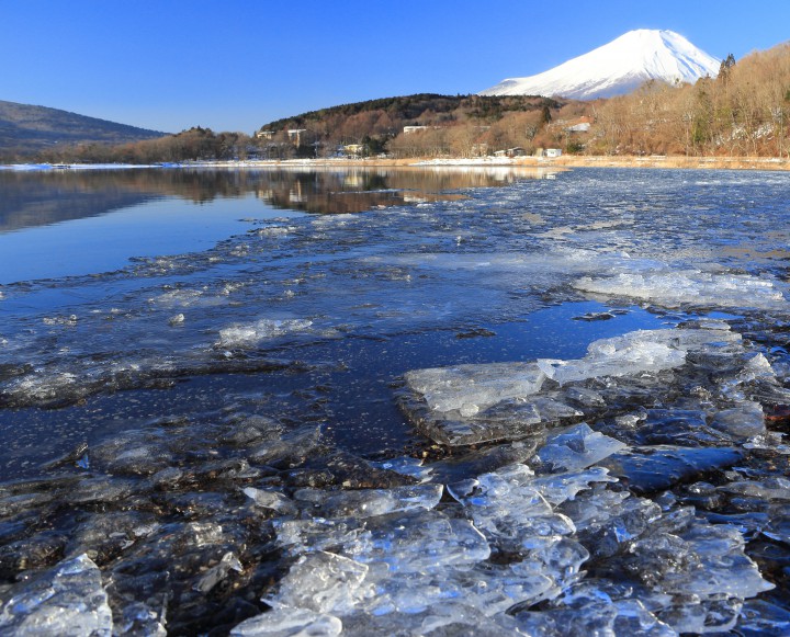 今日の山中湖は晴れ、今朝は今季最低の-16.5℃、日中の最高気温は-1.4℃、2日続けての真冬日となりました。山中湖の平野地区、平野ワンドはかなり氷が張ってきています。写真は朝9時30分、流氷が浮かんで見えますが全て凍っています。浜辺との境はまるで鮫のキバのようでした。氷の模様は5m横にずれただけで雰囲気が変わり、写真を撮っていてとても楽しいです。