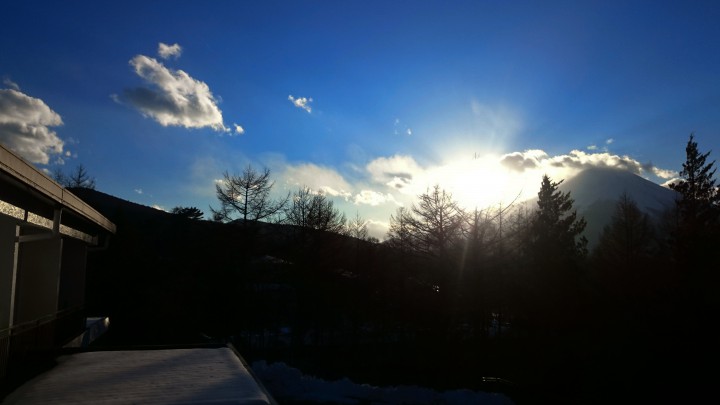 ダイヤモンド富士とは、富士山頂から太陽が昇る瞬間と夕日が沈む瞬間にまるでダイヤモンドが輝くような光景が見られる現象のことで、山中湖では太陽が沈む現象のみです。写真は午後4時17分、当館ホールから富士山を撮ってみましたが、全然ダイヤモンド富士ではありませんでした。山中湖畔では山中地区でそろそろ見られます。今日の山中湖は晴れ、今朝の最低は-10℃、最高は-0.1℃の真冬日でした。17/01/23