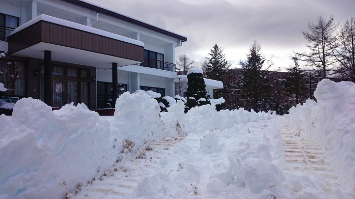 昨日の午後から降り出した雪は午後2時には止み、報道発表によると山中湖の積雪は57cmの大雪でした。別館の共立荘庭での計測は湿った重い雪でしたので朝の実測40cm、日中は良く晴れて気温も高く雪はかなり溶けました。山中湖周辺の幹線道路は除雪作業が夜通し行われていたので、朝はほぼ快適に通れました。今朝の最低0℃最高7℃。17/01/09