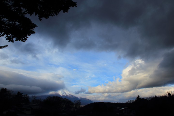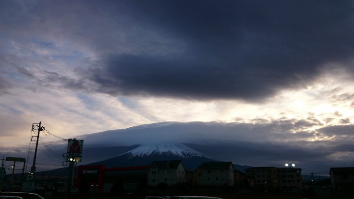 今日の山中湖はくもり時々晴れ、空気がぬるい感じの1日でした。最高気温14℃最低2℃。天気予報では明日は雨。写真は午後4時10分、富士吉田市からの富士山ですが大きな傘雲が富士山頂を覆っていました。富士山に傘雲がかかると雨が降ると言われています。明日は傘の準備して山中湖にお越し下さい。16/12/26