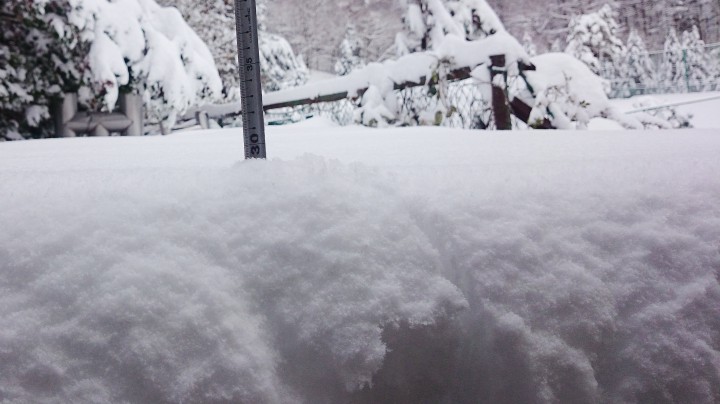 季節外れの大雪は午後2時に止んで、積雪は共立テニスロッヂの庭で29cmでした。ニュースではなぜか山中湖の積雪4cmとのことでした。不思議です。写真は差し金を雪に差し込んで測ったところです。やっぱり29cm。