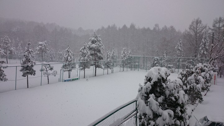 11月の大雪はあまりにも珍しいので今日だけで3枚目のお知らせです。午前2時頃から降り出し午後2時に止んだ雪は29cm積もりました。しかし山中湖の道路は夕方には綺麗に雪掻きがされていて、まさに雪国仕様の対応でした。最高気温1℃最低は夜-5℃。写真は朝9時のテニスコートです。雪が雨のように降っていました。とても11月の写真には見えません。