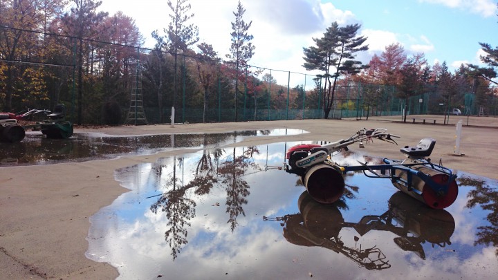 当館のクレーコートはシーズン中、毎日欠かさずブラシ掛けの後にローラー転圧をしています。今日は大活躍したローラーが冬を越すために重しの水を抜きました。春先までお休みです。今日の山中湖は晴れ時々くもり、最高気温14℃今朝の最低0.8℃。今日のダイヤモンド富士は長池地区大池で15:34です。晴れていますが富士山に雲があるので微妙なところです。16/11/12