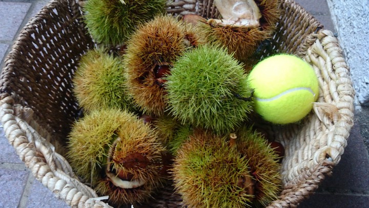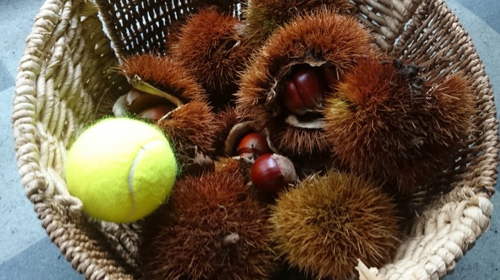 今日の山中湖は午前中くもり、久し振りに雨が降らない朝を迎えましたが、午後からは小雨となりました。写真は親戚の庭で採ってきた栗です。毎年、採っていますが相変わらず大きな栗でした。比較のためテニスボールをカゴに入れてみました。イガイガがボールよりでかいです。栗自体のかなりの大きさでした。今年も栗ご飯が楽しみです。最高気温17℃最低14℃16/09/21