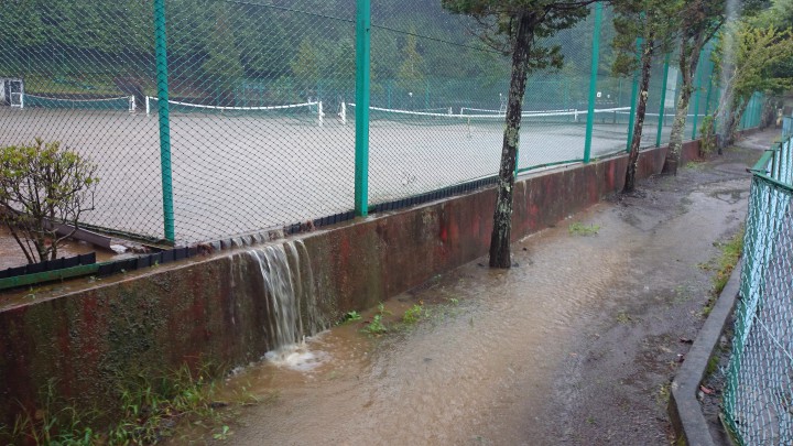 朝から小雨が降ったり止んだりの山中湖でしたが11時30分から大雨になり雷も鳴っていました。写真は少し止んだ12時のものですが、プール状態のテニスコートからあふれ出る水が通路に川を作っていました。雨は夜8時位まで降りつづけ総雨量34mm。ちょうど1週間雨が降り続いたのですが、明日は雨は降らない予報です。最高気温18℃最低14℃
