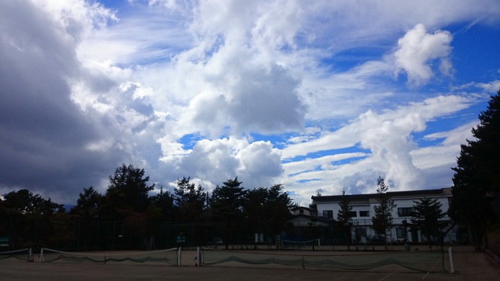 今日の山中湖は朝6時に総雨量1mmの雨が降りましたが、その後は晴れ間が見えて最高気温はなんと27.2℃、本当に暑くなった一日で半袖でokでした。写真は午後2時、テニスコートから富士山方面を撮りましたがまるで夏の空という感じで雲が雄大で圧倒的でした。午後4時になると左側の黒い雲がのびてきて、午後6時まるで夏の夕立みたいな大雨が1時間だけ降りました、総雨量5mm。最低17℃16/09/29