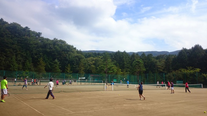 宿泊中のTPP様は3班に分かれて各コートでダブルスの試合を行いました。当館所有のコートは森林に囲まれていて大自然の中でのテニスを味わえます。空気がとても美味しく清閑な場所でテニスを楽しんでいただきたいと思います。今日の山中湖は晴れ、最高気温26℃最低15℃16/09/09