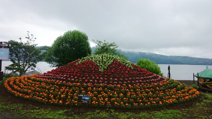 写真の富士山は山中地区の湖畔にある花でできた富士山です。綺麗で華やかな観光地となるように山中湖中はどこにでも立派な花壇があります。いろいろ散策して楽しんでいただきたいと思います。今日の山中湖は一日中小雨、最高気温21℃最低16℃。16/06/22