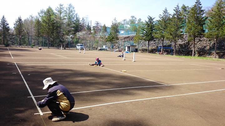 今日は快晴の中、?8〜10コートのラインテープを設置いたしました。これで当館所有の全てのクレーテニスコートにラインを設置いたしました。このあと雨に当ててローラー転圧を繰り返してコートを固めていきます。最高気温は22℃、最低3℃。寒暖の差がありますので山中湖にお越しになる方は体調管理には気を付けて下さい。16/04/26