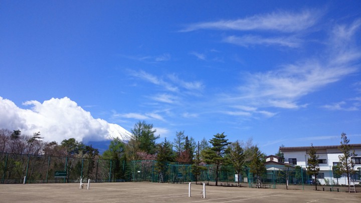 朝からとてもいい天気の山中湖、強化テニスコートから富士山を撮りました。時間は11時。早朝は雲一つ無い快晴でしたが少しずつ富士山から雲が出ている感じになりました。コート整備も気持ちよく行うことが出来ました。明日お越しになるお客様は明日もいい天気の予報ですので富士山を見ながらのテニスを楽しみにして下さいね。