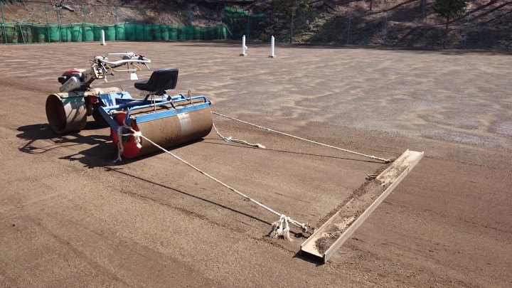 4月9日にトラクターで掘り起こした?8〜10コートを本日、H形鋼を引いて不陸を取り除き平面になるように整備いたしました。この後ローラー転圧して雨を待ちます。雨に当てた後にローラー転圧することで更にコートは固まっていきます。