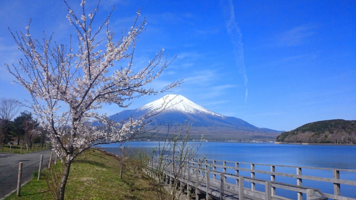 今日の山中湖は午前中快晴で最高気温22.6℃、6月下旬の陽気でしたが、午後は雲が出てきて4時からは霧雨混じりのすごい濃霧となり夜には小雨となりました。午前中の快晴が嘘のような濃霧には驚きました。写真は朝8時きららの湖畔から富士山と桜を撮りました。最低10℃16/04/22