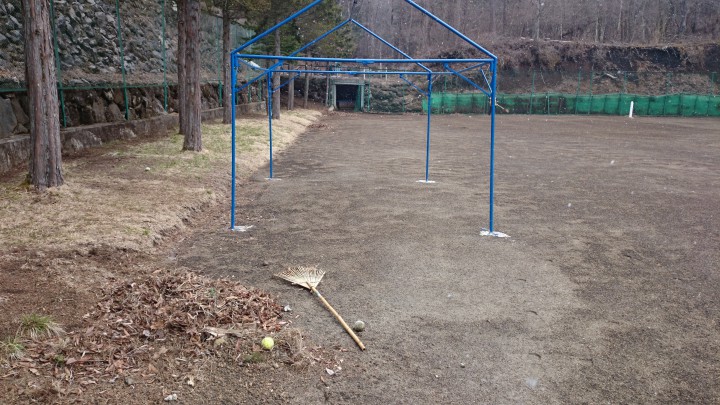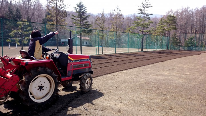 2016年も今日から4月です。当館では昨日に続いてテニスコートの整備を行いました。昨日は耕したコートをローラーで転圧した後、H鋼を引きずり更に転圧。今日は2回目のH鋼引きで更にコートを平坦にしました。