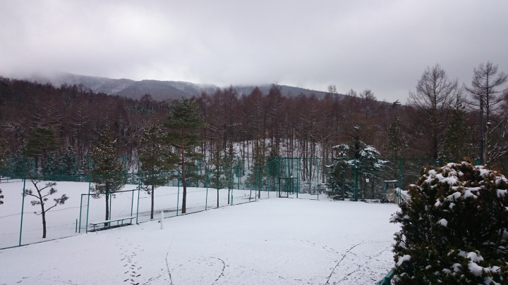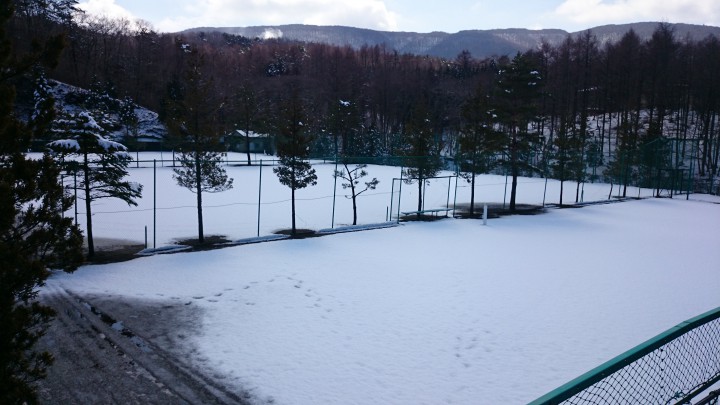 朝6時まで降っていた雪によりテニスコートは真っ白になりました。写真は朝10時。積雪は3cmでしたが10時から3時間ほど晴れ間が見え、2時には雪は全て溶けました。これからテニスコート作りを行うわけですが、乾いた状態の土をトラクターで撹拌しますので、しばらく晴れが続いて欲しいです。最低気温-3℃最高6℃。16/03/26