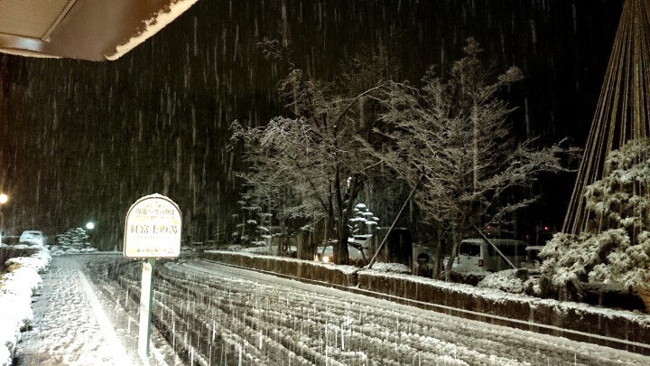 今日の山中湖は曇り時々晴れ、午後6時から雷を伴って大雨となり次第に雪へと変わりました。夜24時には止んで、積雪は10cmほどです。雪は直径3cm位の牡丹雪。最低気温-2℃最高10℃。写真は山中湖温泉「紅富士の湯」で夜の9時、湿った雪がすごい勢いで降っていました。