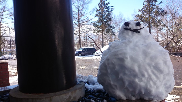 宿泊中のマンドリンの方が作った雪だるま、何ともかわいらしい顔です。山中湖合宿も今日で4日目、明日は最終日です。朝から深夜まで練習で頑張っている皆さんを雪だるまも応援しているような笑顔です。16/03/16