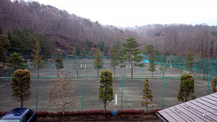 今日の山中湖は朝までには雨が止み午前中は晴れ時々曇りでしたが、夕方4時から雨が降り出し始めました。予報では雨ではありませんでしたが最近は雨がよく降ります。最低気温は夜の3℃、最高12℃。雪はほぼ溶けたようです。写真は午後4時、雨が降り始めた頃のテニスコートです。16/03/20