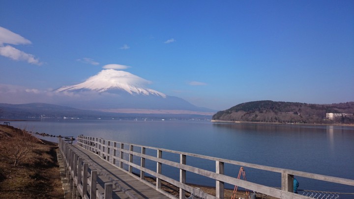 今日の山中湖は晴れのち曇り、最低気温-2℃最高12℃、暖かい一日にとなりました。写真は朝9時の富士山です。気温が高いため既に霞んで見えます。山頂には傘雲があり、天気予報では明日は一時雨が降るようです。今日はのどかな山中湖です。16/03/05