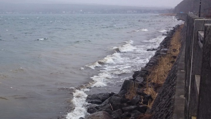 朝から快晴の山中湖は早朝の最低気温-1℃、富士山は綺麗に見えていましたが日中17℃まで気温が上がり、気温の上昇に伴って富士山が霞んでいきました。午後になると曇ってきて一時嵐のような大雨が降ってきました。写真は午後2時30分、ちょうど嵐の時で波が高くなっていました。その後は止んで天気は落ち着きましたが、夜からまた雨、明日は雨の予報です。16/03/06