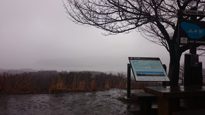 今日の山中湖は朝から晩まで一日中雨でした。朝方の最低気温は8℃最高気温は11℃暖かい雨の日になりました。明日は晴れで更に気温が上がり5月の陽気とのことです。写真は明神峠パノラマ台から富士山方面を撮りましたが、天候が悪く何とか山中湖の岬がぼんやりしているのが分かる程度でした。