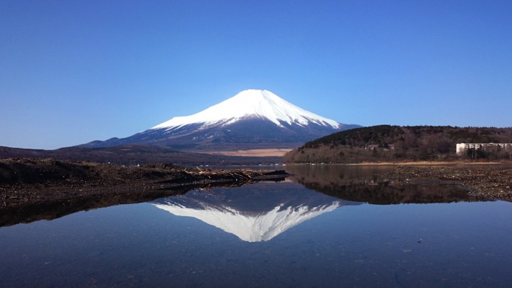 今日の山中湖は春日和、とても気持ちがいい1日でした。最高気温は18.2℃、5月の陽気です。写真は朝8時、雲一つ無い青空に逆さ富士です。ピントを二つの富士山の真ん中の浜に合わせたらミニチュア模型の富士山みたいになり、面白い写真になりました。明日の予報は曇りのち雨です。16/03/08