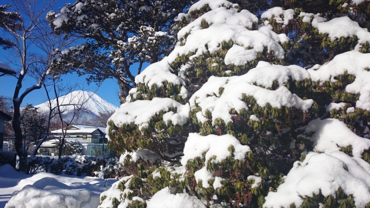 朝庭を見たら深夜に降った雪で辺りが真っ白でした。空は快晴で真っ青。しかし次第に雲が出てきて午後3時になるとものすごい勢いで雪が降ってきて、10秒で体全体が真っ白になる勢いでした。積雪量は10cmくらいです、運転に気を付けて下さい。写真は朝9時快晴。今日の山中湖は晴れのち雪、最低気温-9℃最高0℃16/02/07