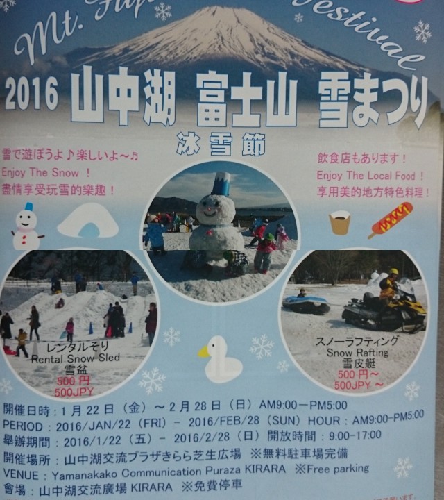 明日から待ちに待った「2016山中湖富士山雪まつり」が開催されます。当初は1/22からの予定でしたが暖冬のため雪が確保できずに開催が危ぶまれていましたが、明日2/5から開催することになりました。2/28まで交流プラザきらら特設会場です。会場にはそりの滑り台やスノーラフティング、雪遊び広場、飲食ブースがあるらしいです。お楽しみに