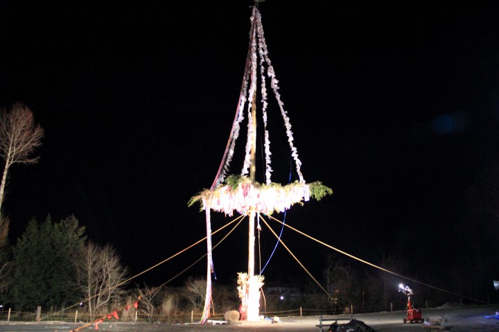 暗くなってから平野コミュニティセンター駐車場に建ってられている御神木を見に行きました。写真は下から見上げた所です。丸いのが「たいこ」と呼ばれ水平にでている十文字には祝色紙や旗で飾り付けられています。奉納されている旗には今年1年間の無病息災・家内安全・商売繁盛を祈願しています。今日の山中湖は晴れのち曇り、夜8時頃から雪が降り出しました。最低気温-9℃最高4℃