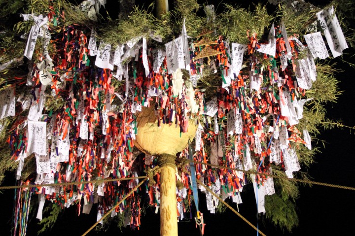 暗くなってから平野コミュニティセンター駐車場に建ってられている御神木を見に行きました。写真は下から見上げた所です。丸いのが「たいこ」と呼ばれ水平にでている十文字には祝色紙や旗で飾り付けられています。奉納されている旗には今年1年間の無病息災・家内安全・商売繁盛を祈願しています。今日の山中湖は晴れのち曇り、夜8時頃から雪が降り出しました。最低気温-9℃最高4℃16/01/17