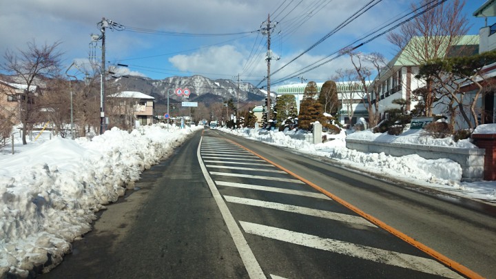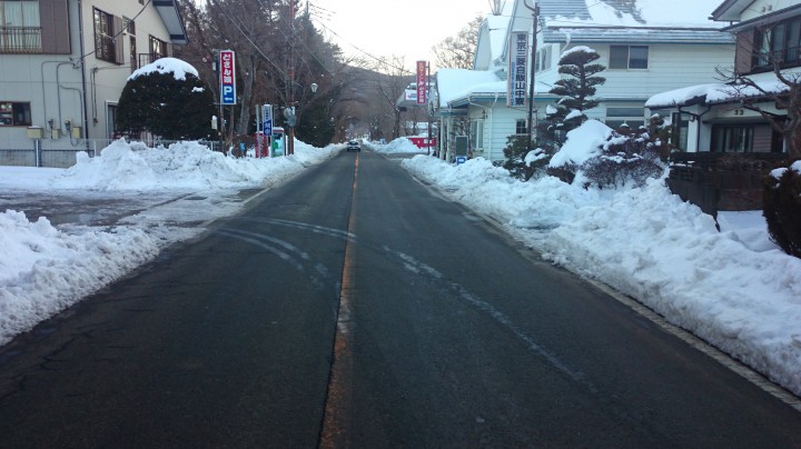 山中湖にタイヤショベルを保有している宿が多数あるため、細い道路もすぐに除雪されます。写真は幹線道路ですが午後4時過ぎの国道413号線。
