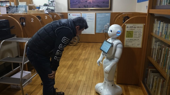 山中湖情報創造館には見習い図書職員ペッパー君がいます。入り口を入って正面突き当たりで待っていました。声を掛けるとちゃんと受け答えをするし、握手もします。楽しい時間でした。山中湖情報創造館は、山中湖村の図書館です。是非足を運んでみて下さい。今日の山中湖は晴れ時々曇り、最低気温-8℃最高2℃。写真は知り合いがペッパー君とおしゃべりしているところです。16/01/22