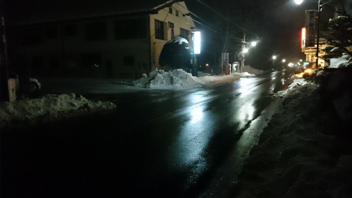 山中湖にタイヤショベルを保有している宿が多数あるため、細い道路もすぐに除雪されます。写真は幹線道路ですが午後4時過ぎの国道413号線。今日の山中湖は晴れ、最低気温-13.8℃、日中の最高-2℃の真冬日。日中、日光を浴びていても肌が寒さでピリピリしていました。